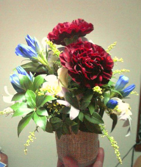 「これって、貰っていいの?」・・・1本のつもりで聞いたんだけど「ちょっと確かめてきます」って聞きに行ってくれたらなんと!「お持ち帰りいただけます」って、オアシスごとアレンジのお花を一人に一つづつ頂いちゃいました